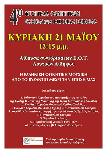 Την Κυριακή 21 Μαΐου 2017 θα διεξαχθεί το 4ου Φεστιβάλ Χορωδιών, που είχε αναβληθεί λόγω της αιφνίδιας απώλειας του καλού φίλου και εξαίρετου μέλους