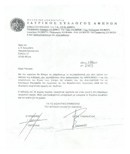 Ο Ιατρικός Σύλλογος Αθηνών έστειλε επιστολή προς τον Υπουργό Εσψωτερικών Π. Σκουρλέτη, με την οποία εκφράζει την συμπαράστασή του στον αγώνα των Αιδηψίων