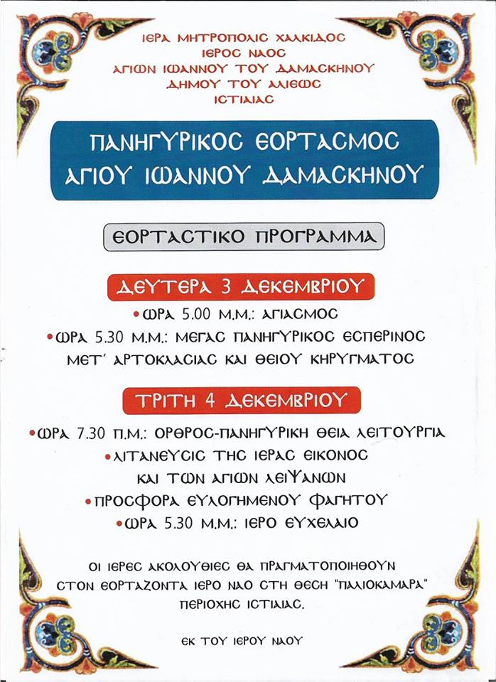 Εορτασμός Αγίου Ιωάννη του Δαμασκηνού