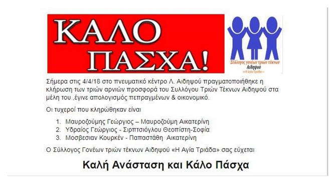 Στις 4/4/18 στο πνευματικό κέντρο Λ. Αιδηψού πραγματοποιήθηκε η κλήρωση των τριών αρνιών προσφορά του Συλλόγου Τριών Τέκνων Αιδηψού στα μέλη του