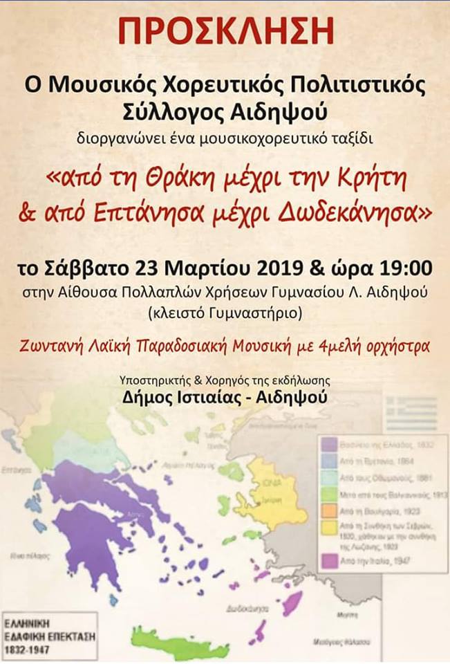 Στο σχεδόν γεμάτο από κόσμο Κλειστό Γυμανστήριο του Γυμνασίου – Λυκείου Λουτρών Αιδηψού, το Σάββατο 23 Μαρτίου 2019 πραγματοποιήθηκε εκδήλωση – μουσικοχορευτικό ταξίδι στην Ελλάδ