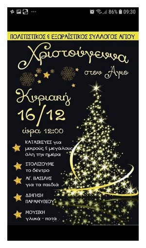 Στον περίβολο του Ι.Ν Αγίου Γεωργίου Αγίου στον Άγιο, την Κυριακή 16/12 /2018 και ώρα 3:00μ.μ. θα πραγματοποιηθεί εκδήλωση