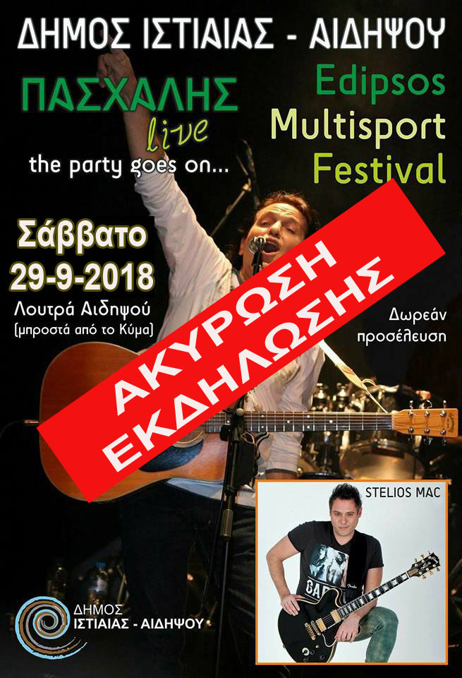 Λόγω των δυσμενών καιρικών συνθηκών η μουσική βραδιά με τον Πασχάλη μετατίθεται για αύριο Σάββατο 29/9/18.