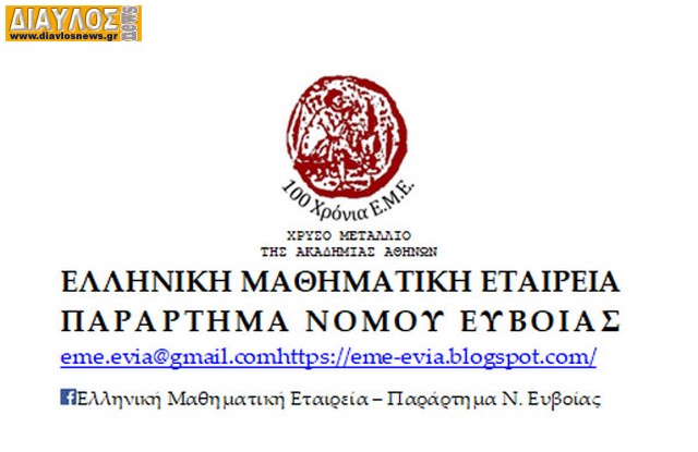 Το Παράρτημα της Εύβοιας της Ελληνικής Μαθηματικής Εταιρείας βρίσκεται στην ευχάριστη θέση να πληροφορήσει τα μέλη και τους φίλους του πως η 39η Εθνική Μαθηματική Ολυμπιάδα «Ο Αρχιμήδης» για τους/τις 15 μαθητές/ριες της Εύβοιας και τους/τις 6 της Βοιωτίας που προκρίθηκαν σε αυτή, θα πραγματοποιηθεί το Σάββατο 26/2/2022 και ώρα 10:00 στο ΓΕΛ Δροσιάς (Περιφερειακός Δροσιάς-Λουκισίων 34100, τηλ. 2221099922, Αυτή η διεύθυνση ηλεκτρονικού ταχυδρομείου προστατεύεται από τους αυτοματισμούς αποστολέων ανεπιθύμητων μηνυμάτων. Χρειάζεται να ενεργοποιήσετε τη JavaScript για να μπορέσετε να τη δείτε.).