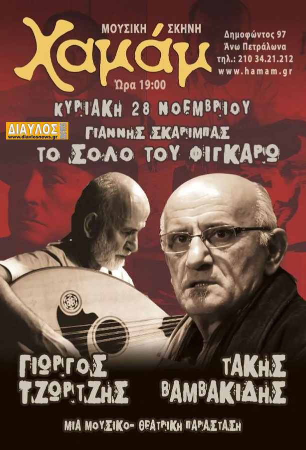 Μια μουσικο-θεατρική παράσταση, βασισμένη στο μυθιστόρημα του Γιάννη Σκαρίμπα, «Το Σόλο του Φίγκαρω», παρουσιάζουν ο συνθέτης και τραγουδιστής Γιώργος Τζώρτζης και ο ηθοποιός Τάκης Βαμβακίδης