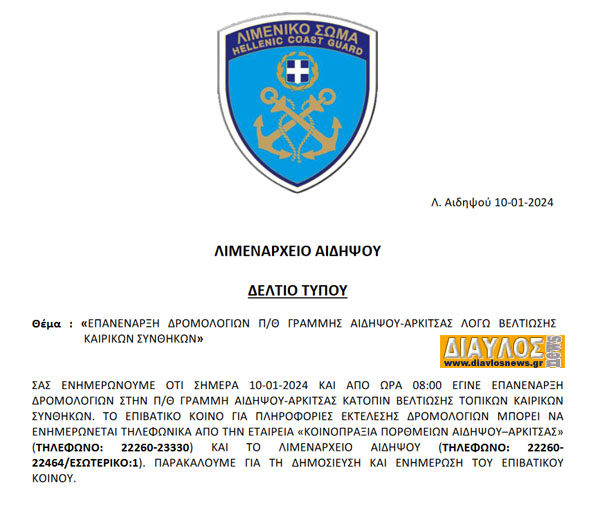 ΕΠΑΝΕΝΑΡΞΗ ΔΡΟΜΟΛΟΓΙΩΝ ΠΟΡΘΜΕΙΑΚΗΣ ΓΡΑΜΜΗΣ ΑΙΔΗΨΟΥ - ΑΡΚΙΤΣΑΣ ΛΟΓΩ ΒΕΛΤΙΩΣΗΣ ΚΑΙΡΙΚΩΝ ΣΥΝΘΗΚΩΝ.