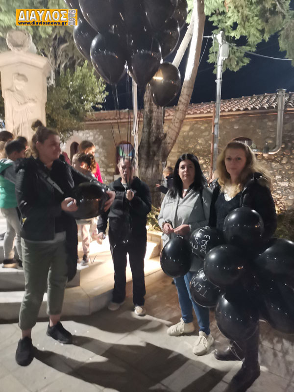 Τήρηση ενός λεπτού σιγής στην πλατεία Ιστιαίας και στη συνέχεια οι μαθητές του 1ου Δημοτικού άφησαν ελεύθερα στον αέρα μαύρα μπαλόνια που έγραφαν «ΤΕΜΠΗ 2023».