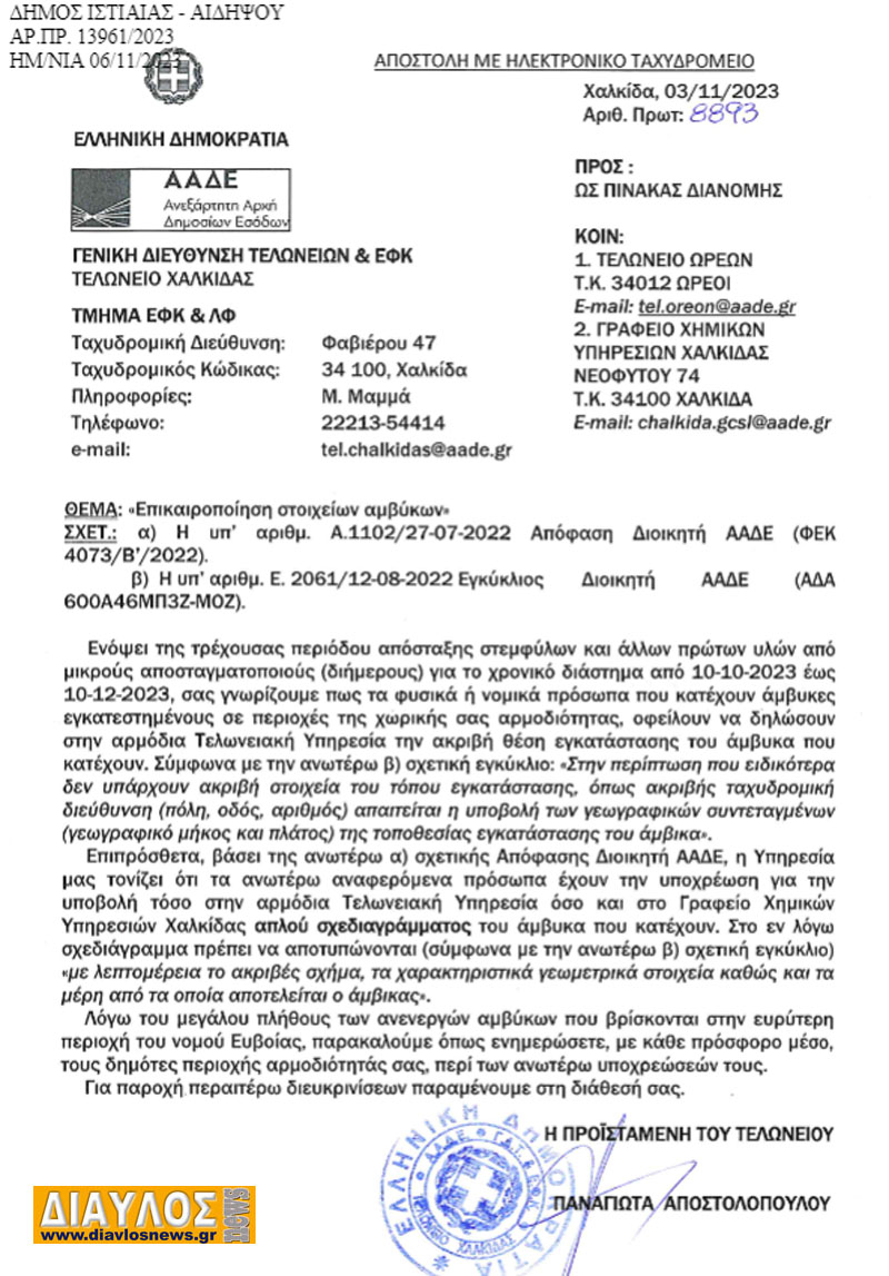 • Φυσικά ή νομικά πρόσωπα που κατέχουν άμβυκες (παραδοσιακά καζάνια απόσταξης) οφείλουν να δηλώσουν την ακριβή θέση τους. Στην περίπτωση που δεν υπάρχουν ακριβή στοιχεία απαιτείται η υποβολή των γεωγραφικών συντεταγμένων