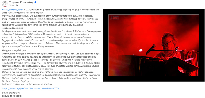 Η συνέχεια ήταν του Σταμάτη Κραουνάκη και των συνεργατών του. Εμείς τι θα μπορούσαμε να πούμε, όταν ο ίδιος ο Σταμάτης με ανάρτηση του τα είπε όλα.  Οπότε,  αφου ευχαριστήσουμε το Σύλλογο Πολιτιστικής Κίνησης Μονοκαρυάς, τα μέλη του, τους εθελοντές και τους μουσικούς που μας ταξίδεψαν,  αφήνουμε τον καλλιτέχνη να μιλήσει για τη μουσική βραδιά στη Μονοκαρυά: